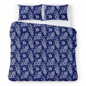 Памучно спално бельо от креп комплект дишащо без гладене white with navy blue flowers