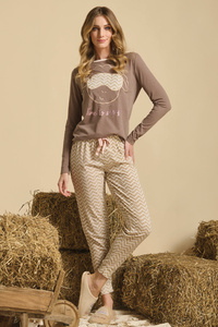 Дамска пижама Mefemi by Nipplex Selene PX75, бежова - памучна, с дълги ръкави и панталон с животински принт