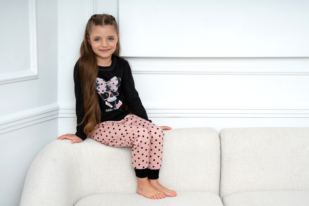 Пижамата включва панталони в розово и черен грах, завършващи с оребрен подгъв, и потник със сладък принт.
