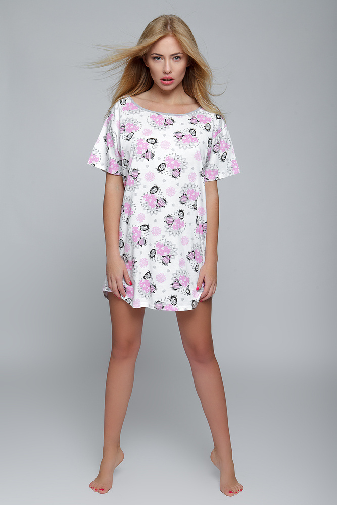 Дамска риза от висококачествен 100% памук, който в комбинация със свободната кройка осигурява максимален комфорт при носене. Осигурява пълна свобода на движенията. Оригинално голямо деколте, което може да се преметне секси през рамо. Тениска с къс ръкав, украсена с шарка на пингвин. Полукръгъл завършек в долната част. Той ще се хареса на жените, които обичат мекотата и свободата.