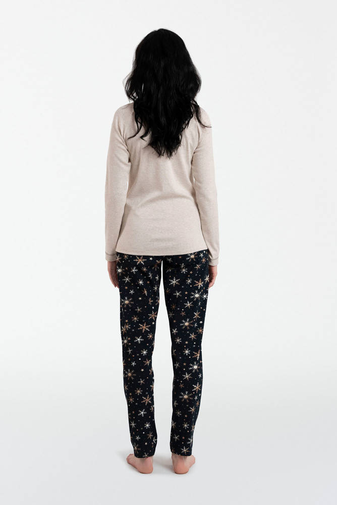Модерните дамски пижами са подходящи за бизнес пътувания и почивки, както и за вкъщи. Простата, класическа кройка е гаранция за комфорт и свобода, а естественият материал ще осигури подходящ топлинен комфорт през студените нощи. Памучната дамска пижама с дълъг панталон и дълъг ръкав завършва с кръгло деколте, под което има декоративна, очарователна панделка и прекрасен модел на снежинки. Такива женствени пижами обещават приятен нощен сън. Пижамата за жени се предлага в размери от S до XL и в нюанси на черно и меланж бежово.