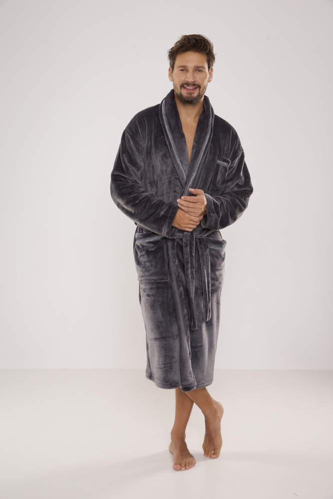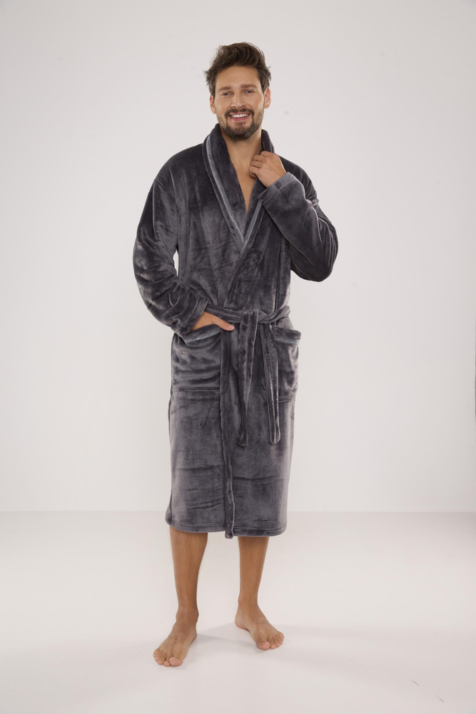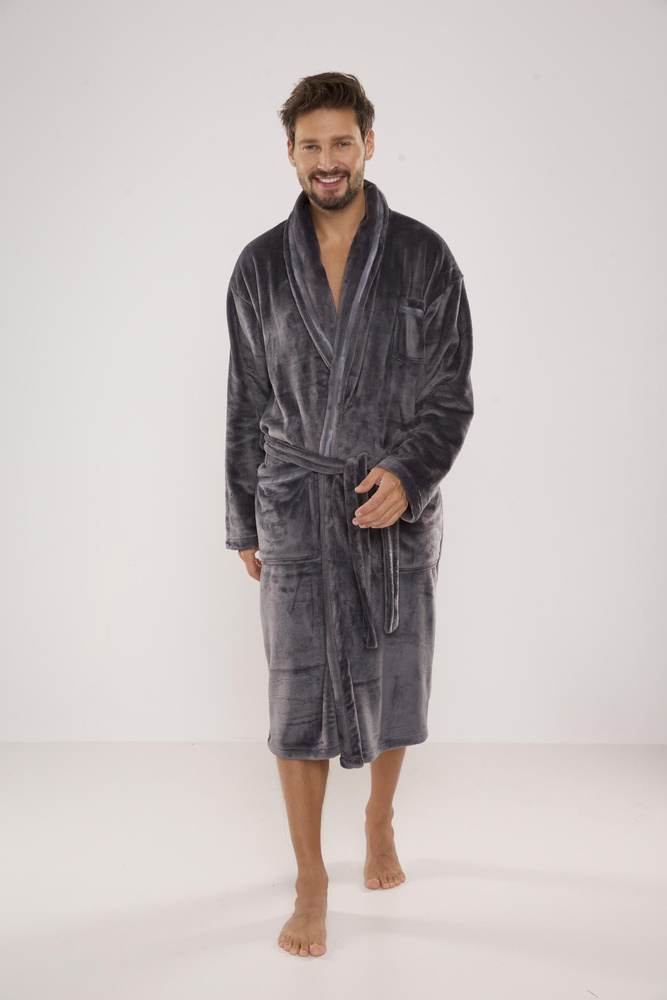 Мъжки дълъг халат от мека трикотажна материя. Връзка на талията, външни джобове на бедрата, джоб на гърдите. Хубав и приятен на допир, гарантиращ комфорт при носене. Основното предимство на този модел е топлата и приятна на допир плюшена материя, която абсорбира отлично водата.