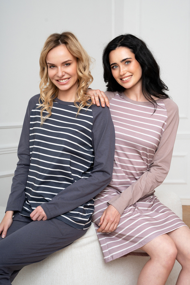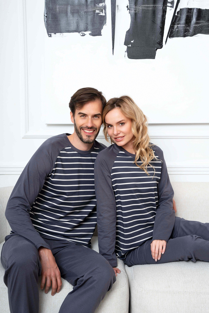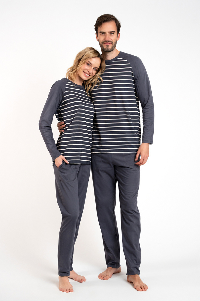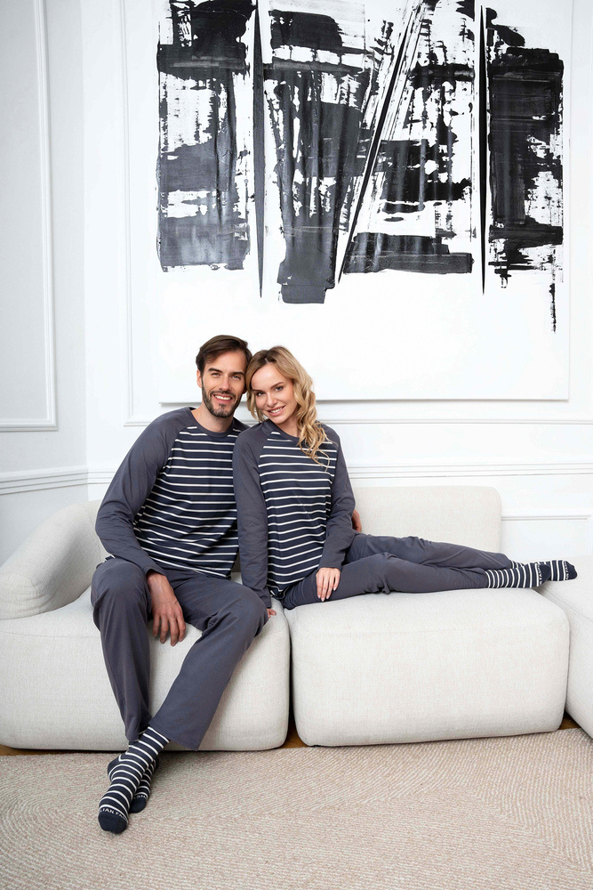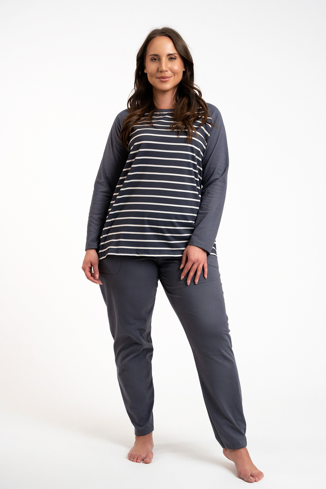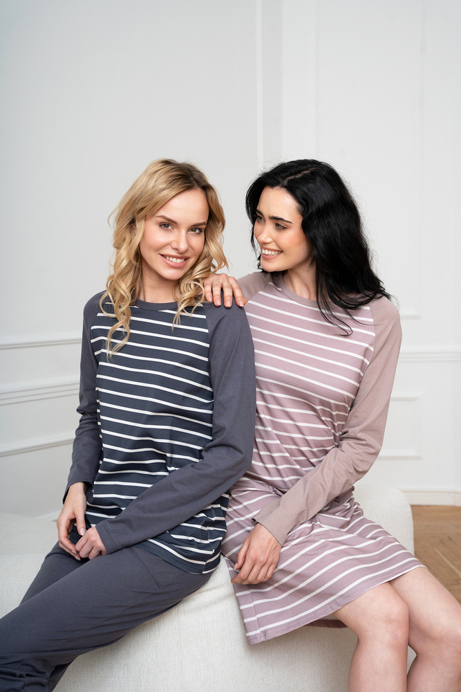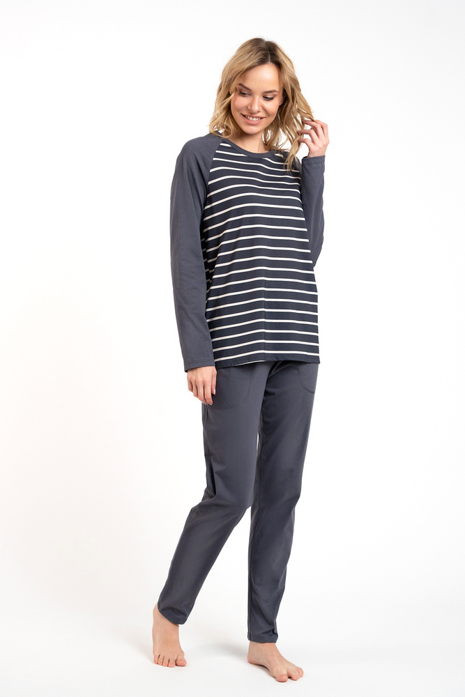 Дамската пижама с дълги панталони и дълги ръкави е класика, която ще се използва добре както за по-хладните нощи у дома, така и за разходки. Елегантната, женствена пижама със свободна кройка ще ви осигури комфортен сън, а безопасната и дишаща материя - 100% памук - ще се погрижи за удоволствието на кожата ви. Вечната шарка на райета подхожда на дами от всички възрасти. Олекотена дамска пижама с неотстраняващ се ластик, в семпъл стил, трябва да бъде в гардероба на всяка жена. Дамската памучна пижама се предлага в два цвята - графит и бежово - и в размери от S до XXL.