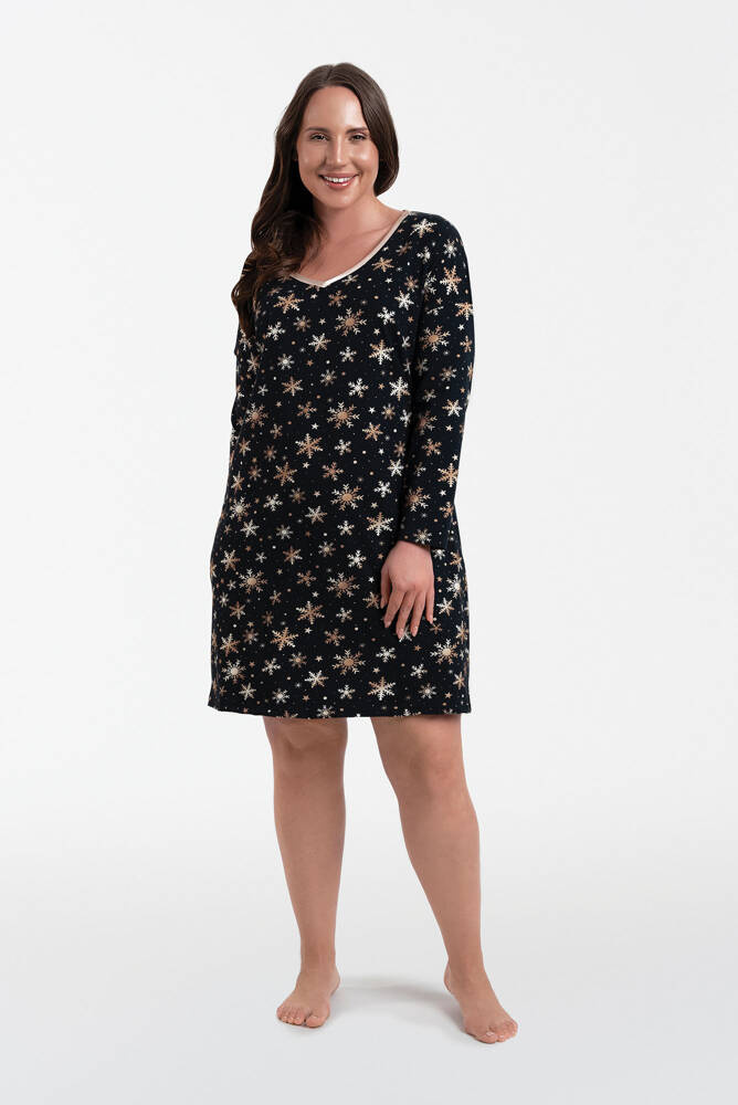 Памучната нощница е идеална за студените нощи. Свободната кройка ще ви осигури пълна свобода на движенията и комфорт, а естественият материал ще ви осигури топлина и удобство. Дамската риза за сън има красив, оригинален десен на снежинки, който придава чар, както и деколте във формата на сърце, завършено с декоративна елегантна тапицерия. Дължината на ризата е преди коляното, което я прави да изглежда много добре на всяка фигура. Нощницата за жени се предлага в размери от S до XXL, в черно с нюанси на бежово.