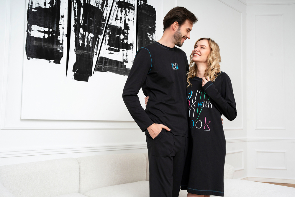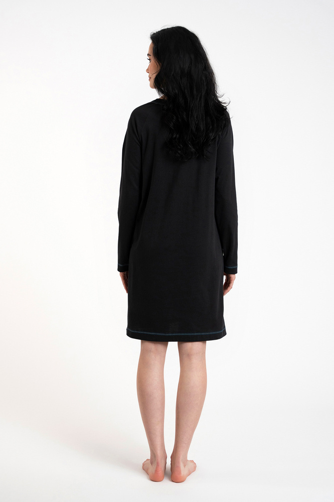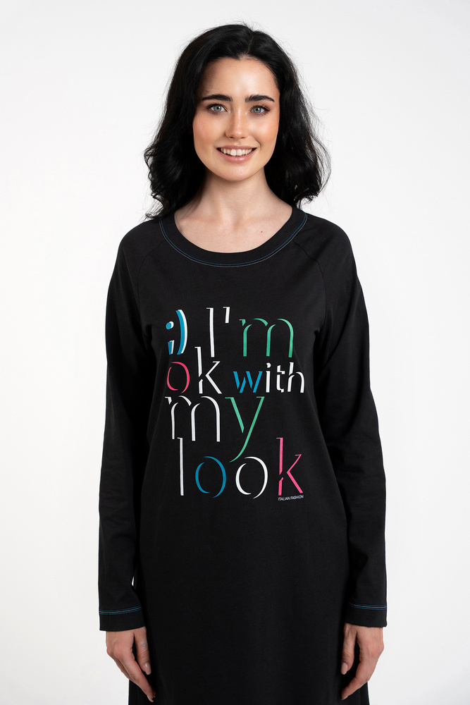 Модерната нощница ще направи всяка нощ по-приятна. Естественият материал ще позволи на кожата да диша, а правата кройка и дължината под коляното ще осигурят комфорт и свобода на движенията. Дамската риза за сън е с класическо кръгло деколте, а предната част е украсена с атрактивна графика - цветен ситопечат, който ще остане на мястото си дори след многобройни изпирания. Стилът на тази интересна дамска нощница със сигурност ще се хареса на всяка жена. Памучна нощница, налична в размери от S до XXL и в черно.
