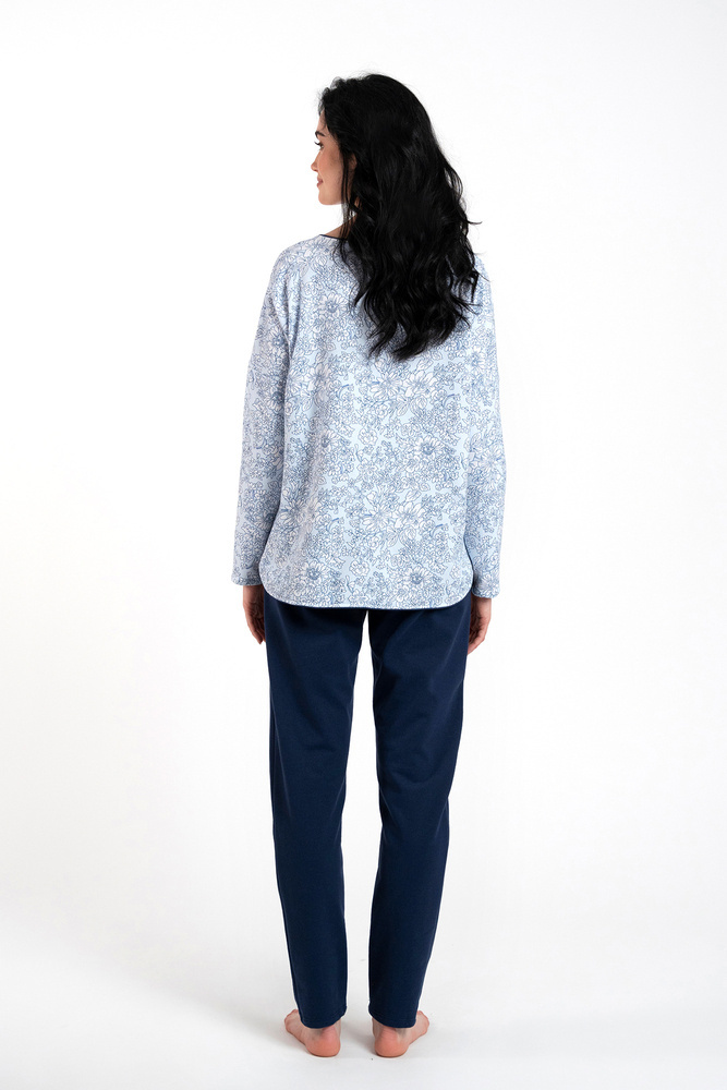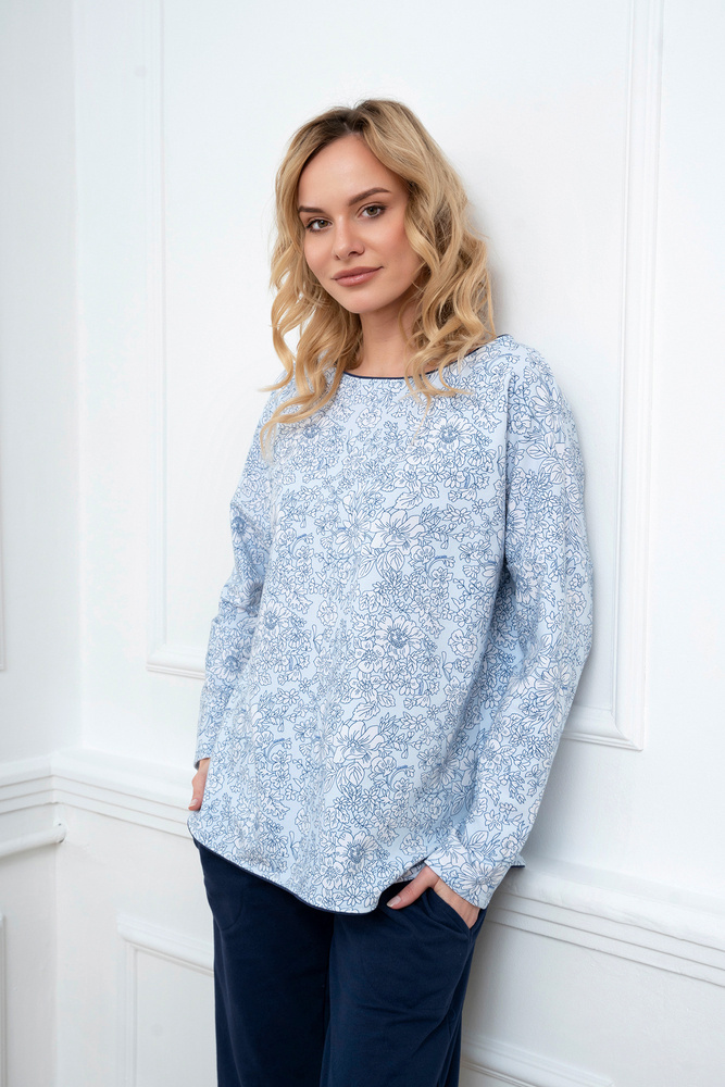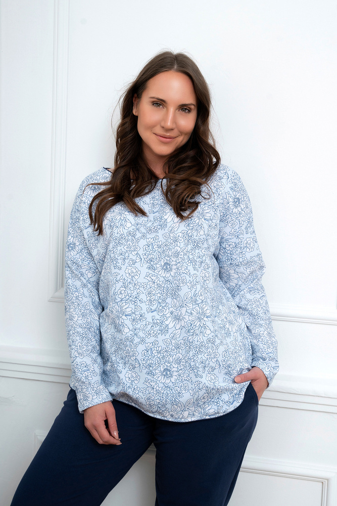 Топлите, приятни за тялото дамски пижами с дълги панталони и дълги ръкави със сигурност ще ви бъдат полезни през студените нощи както у дома, така и навън. Свободната и права кройка ще осигури комфорт и свобода на движенията, а приятният за окото флорален десен ще се хареса на всяка жена. Блузата на дамската пижама е с кръгло деколте и леки вдлъбнатини в страничните шевове, а панталонът е напълно прав, което прави този комплект класически, но модерен дамски спален комплект. Дамска пижама за спортни екипи в размери от S до XXL, в сини, бели и тъмносини цветови тонове.