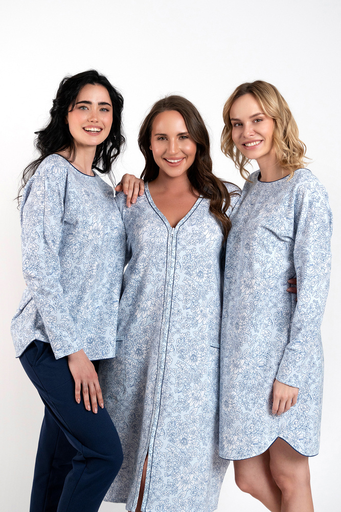 Удобна пижама - добър сън през нощта! Тази дамска риза за сън, изработена от пуловер, мека и приятна за кожата, със сигурност ще допринесе за това. Свободната кройка осигурява свобода на движенията, а дължината до коляното е изключително удобна. Долната част на дамската нощница е леко заоблена, а отстрани има малки изрязвания, които придават стил. Дамската памучна риза за сън е идеална за по-хладните нощи, а приятният за окото флорален десен ще се хареса на всяка жена. Памучната нощница се предлага в размери от S до XXXL и в синьо-бяла цветова гама.
