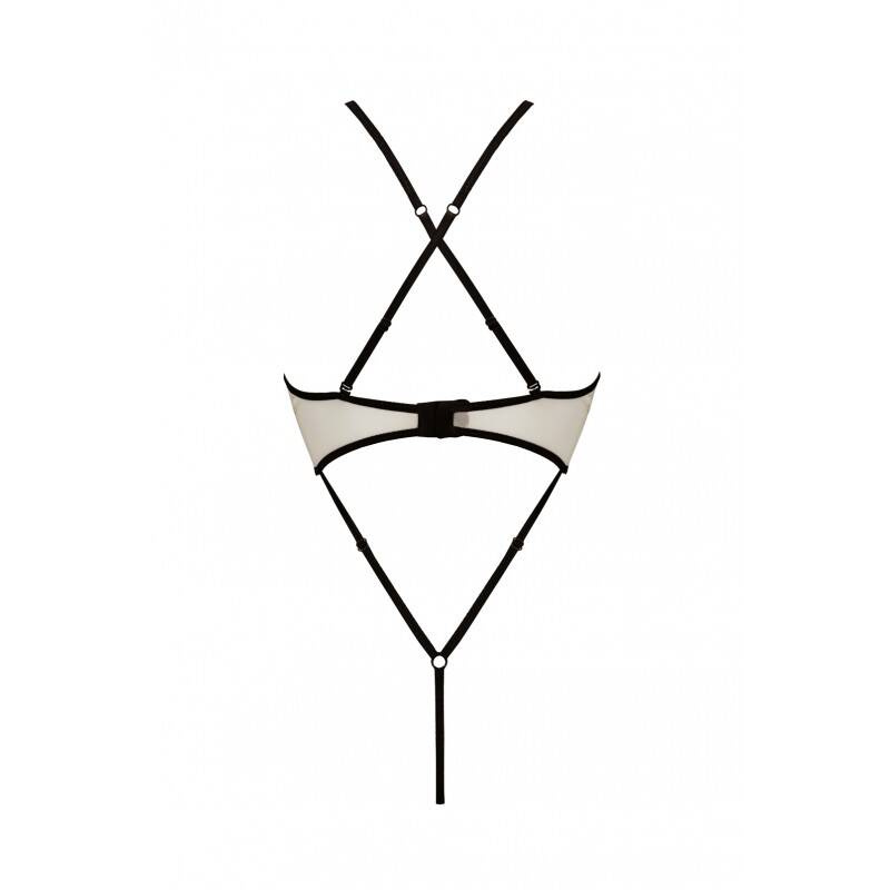 Fantastyczne zestawienie bieli z czarnymi detalami. To niezwykłe body, mocno wycięte modeluje sylwetkę oraz sprawia, że poczujesz się wyjątkowo seksownie. Niebanalnie zdobiony dekolt, a do tego odsłonięte plecy. Całości charakteru dodaje otwarty krok.