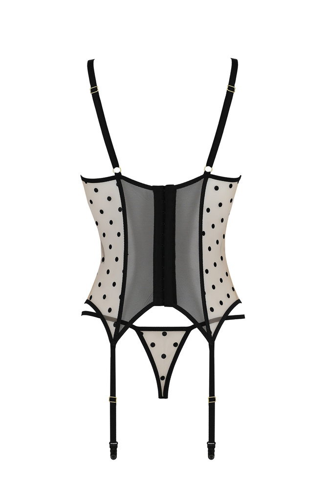Bardzo zjawiskowy gorset Martina to połączenie transparentnego tiulu z niezwykle gustownym wzorem w kropeczki. Górna część gorsetu to otwarte miseczki. Biust jest podtrzymany, dzięki zastosowaniu fiszbin i usztywnienia. W komplecie znajdują się urocze stringi. Komplet dostępny w dwóch wersjach kolorystycznych - czerni i beżu.