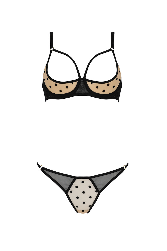 Zestaw Marina składa się z dwóch części - stringów i biustonosza. Biustonosz to model o półotwartych miseczkach, z paskami okalającymi piersi. Efekt? Piersi seksownie wyeksponowane, kuszące. Zestawienie tiulu w kropki to fantastyczne połączenie tego co niewinne i tego co mega sexy. Komplet występuje w dwóch wersjach kolorystycznych beżowej oraz czarnej.