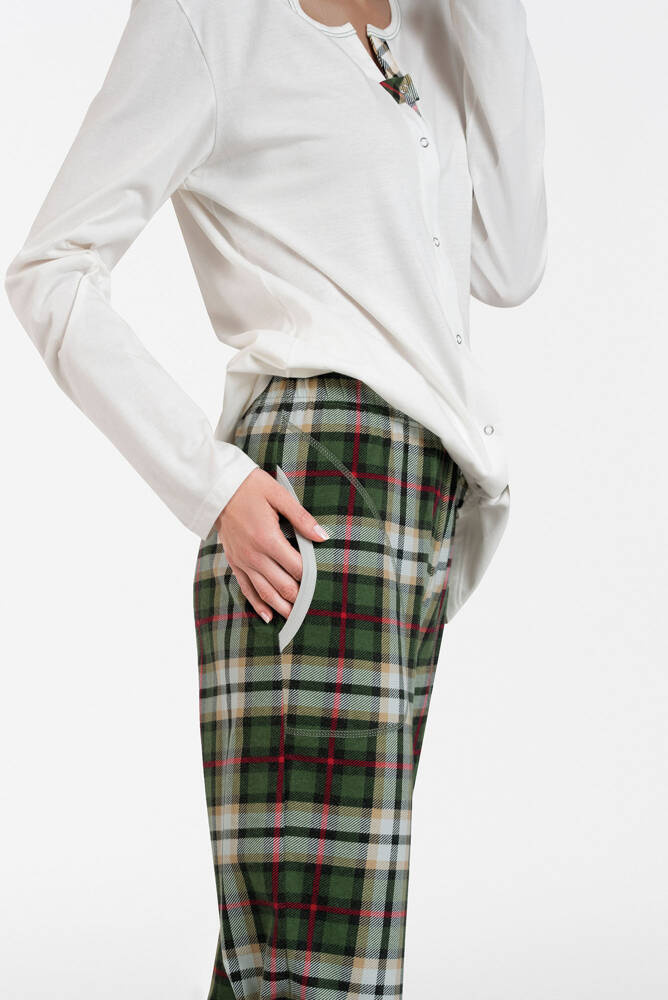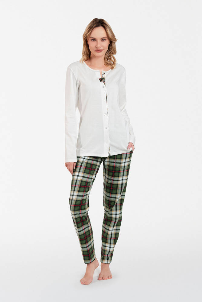 Може ли пижамата да бъде елегантна? И все пак как! Тази уникална дамска пижама с разкопчани копчета и кариран панталон ще се хареса на всяка дама, която цени добрия стил дори в уединението на спалнята. Дамската памучна пижама е от мека и приятна материя, а модният модел придава характер. Горнището на пижамата е с вкус и кариран десен, има кръгло деколте и пълно закопчаване с цип, а правата кройка на панталона ще ви осигури комфорт и удобство. Практични джобове в панталоните. Стилната дамска пижама се предлага в размери от S до XXL, в два цвята - екрю или зелено.