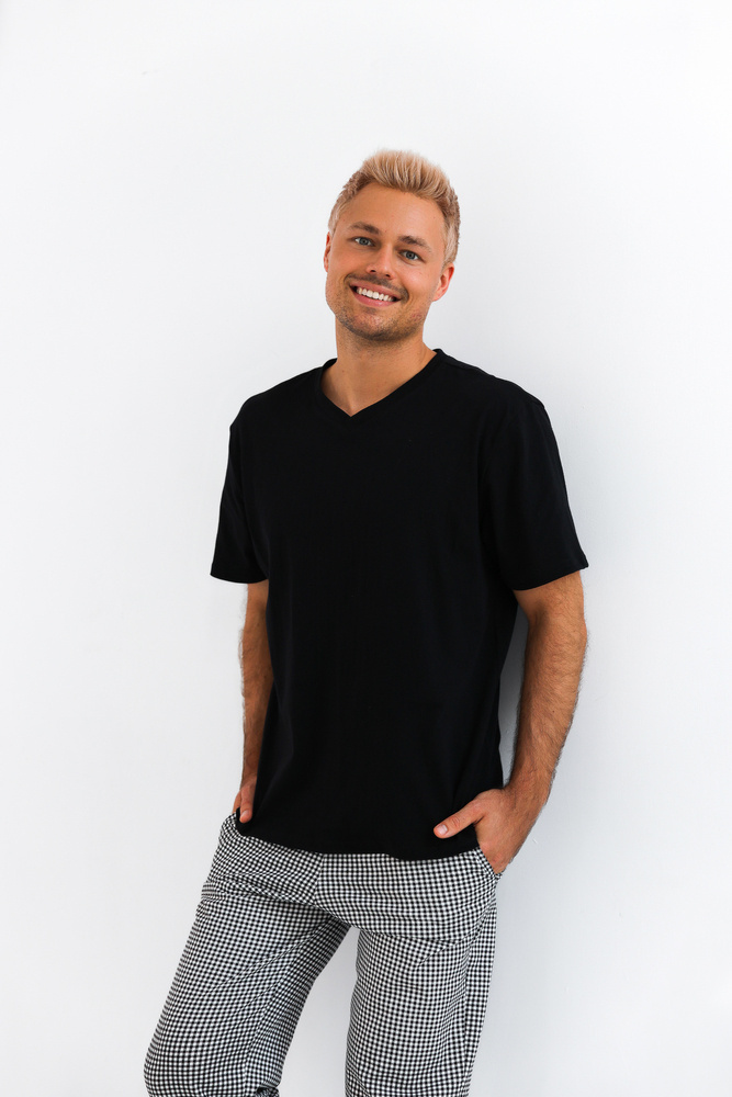 Удобна и комфортна мъжка пижама от висококачествен памук. Тениска с къс ръкав. В комплект с дълги панталони с шарки. Удобен еластичен колан. Модел с джобове.