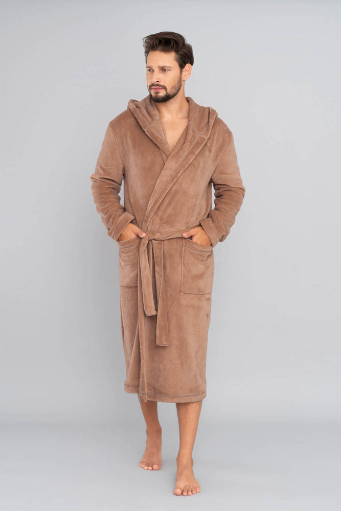 Дълъг мъжки халат за баня с качулка, завързан на кръста.