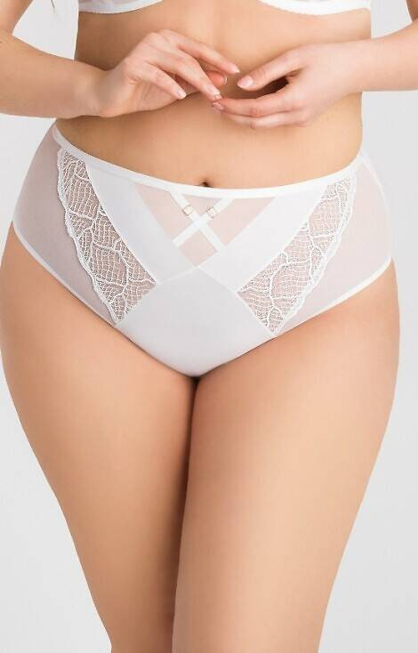 Дамски бикини с висока талия. Открита рана, покриваща почти цялата седалищна област.Изработен от еластичен тюл в комбинация с непрозрачен микрофибър и бродерия.