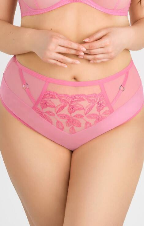 Дамски бикини с висока талия. Открита рана, покриваща почти цялата седалищна област. Изработен от еластичен тюл в комбинация с непрозрачен микрофибър и бродерия.