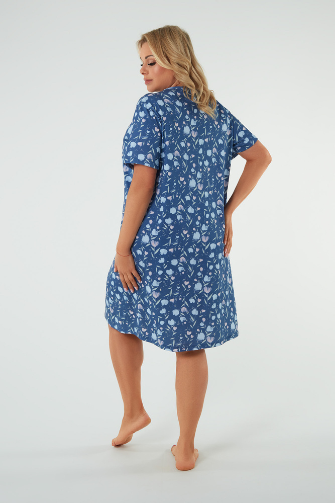 Нощницата с къс ръкав е балансирана комбинация от елегантност, финес и комфорт. Има свободна кройка, която обгръща свободно силуета. Отпред дамската нощница е с V-образно деколте и декоративни гънки. Декоративна сатенена панделка на деколтето. Цялостен флорален принт, който придава много лекота и женско очарование. Памучната ни нощница е с дължина до коляното.