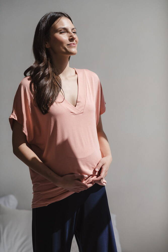 Bluzka od piżamy ciążowej Moon z krótkim rękawem to element kolekcji Moon. Wykonanej z bambusowej dzianiny, którą pokochasz od pierwszego założenia - jest niezwykle miękka i jedwabiście gładka. Proste i niezwykle wygodne rozwiązanie ułatwiające karmienie piersią - wzmocniony dekolt V - wystarczy odchylić i szybko nakarmić maluszk. Krój oversize bluzek - najpierw pomieszczą nawet bardzo duży ciążowy brzuszek a po porodzie każda sylwetka będzie w nich dobrze wygląda. Najwyższej jakości, oddychające dzianiny, które przeszły rygorystyczne testy Oeko-Tex Standard 100 - wiemy, że materiał jest bezpieczny dla dziecka i mamy. Uszyte w Polsce