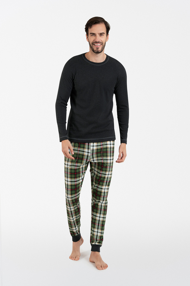 Класическа мъжка пижама с дълги панталони и дълги ръкави, при която панталоните са изцяло украсени с кариран десен. Мъжката пижама е с права кройка, която гарантира комфорт, и с естествен материал, който е дишащ и приятен за кожата. Блузата на модерната мъжка пижама е с кръгло деколте, а панталонът е с удобен оребрен подгъв в долната част на крачолите.