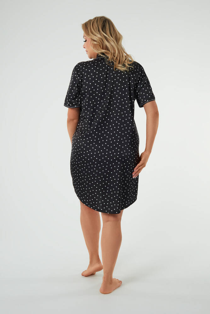 Ако се интересувате от елегантни нощници, сте попаднали на идеалното място. Сатенената нощница за жени е опция, която ще добави специално докосване към нощния ви гардероб. Тя е със свободна, класическа кройка, която ще ви осигури комфорт не само вечер, но и сутрин. Това е нощница с цяла дължина, разкопчана с практични копчета. V-образното деколте е завършено с класическа яка с отличителен кант. Отпред има и малък джоб. Цялата е украсена с шарка от очарователни сърца. Тази сатенена нощница е с къси ръкави, които ще се ползват добре през пролетта и лятото.