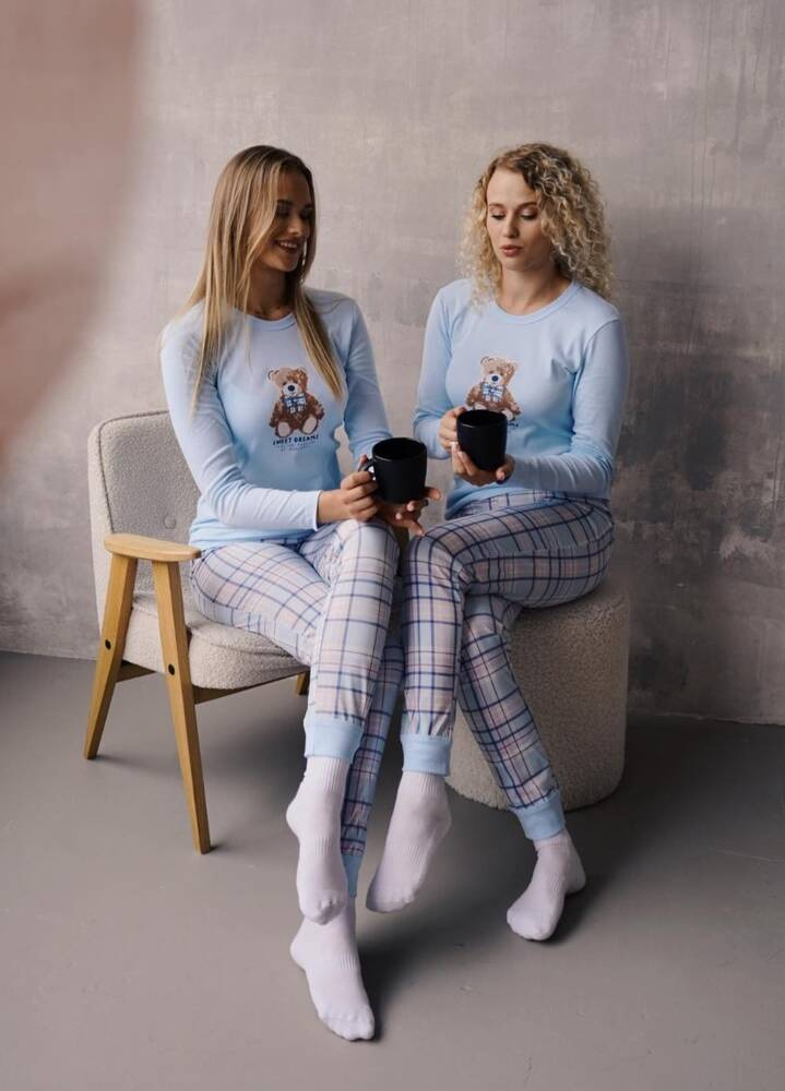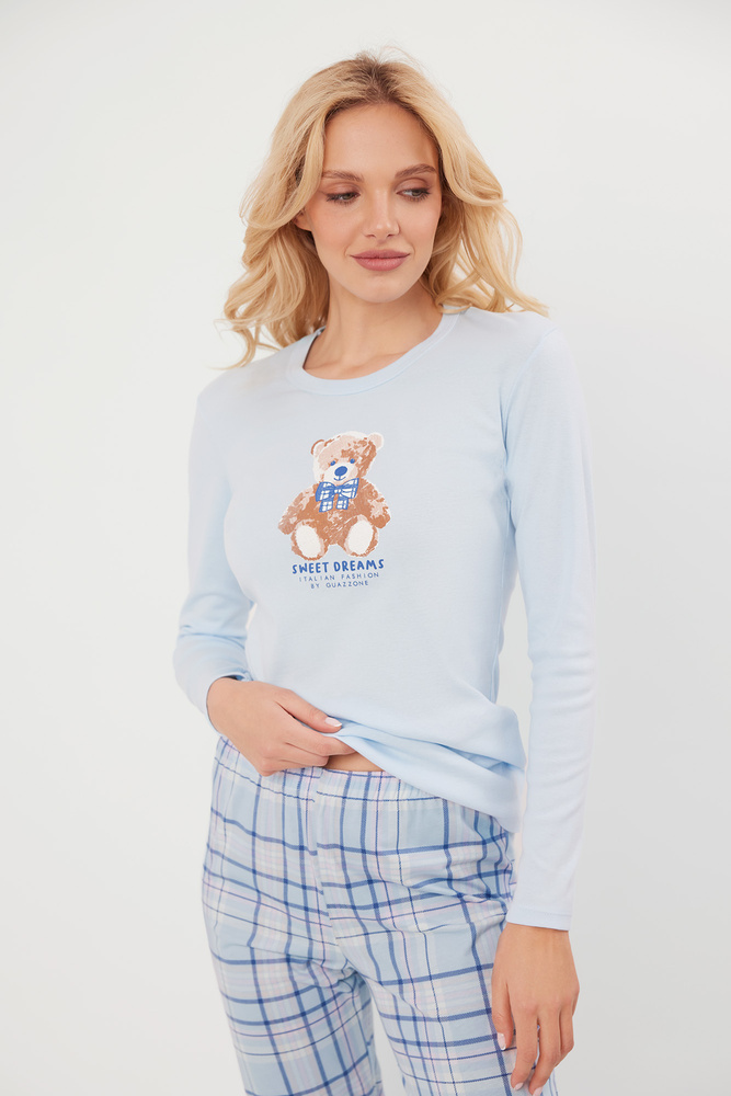 Дамската пижама Katrin се отличава с леко вталена линия, която осигурява комфорт и подчертава силуета. Блузата е с дълъг ръкав, кръгло деколте и декоративна щампа, изобразяваща сладко плюшено мече и надпис "Sweet Dreams" Италианска мода от Guazzone. Панталоните с класическа кройка, с модерен кариран десен в долната част на крачолите, имат практични шнурове, които придържат панталоните на място и предотвратяват издърпването им по време на сън.
