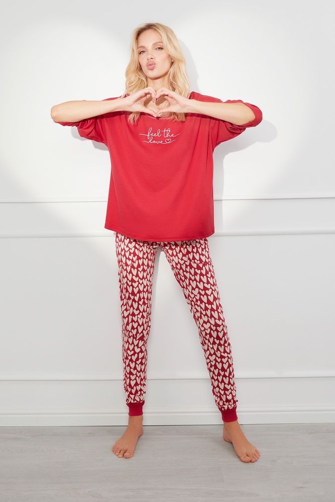 Дългите дамски пижами с права кройка са проектирани за максимален комфорт. Горнището е блуза с дълъг ръкав в едноцветен цвят с надпис "FEEL THE LOVE". Кръглото деколте е завършено с контрастен подгъв. Панталоните с романтичен десен на сърце са завършени с оребрени маншети за перфектно прилягане. Цялата материя е изработена от удобен и приятен на допир памук.