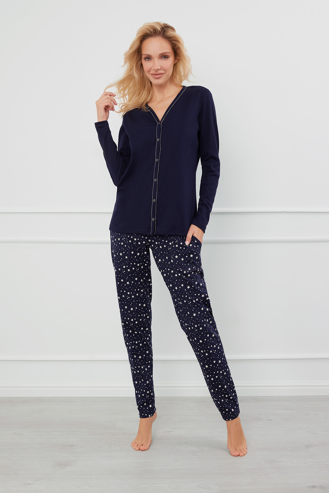 Разкопчана дамска пижама от памучно ребро, отличаваща се с неподвластен на времето дизайн. Тя е с класическа кройка с дълги ръкави и V-образно деколте, което е обточено с фин конец в контрастен цвят. Дълги панталони с модерен принт на звезди привличат погледите. Практични джобове отстрани. Добавете факта, че това е дамска пижама без копчета, а ясно обозначеният панел с копчета придава класа и изящество на цялата визия.
