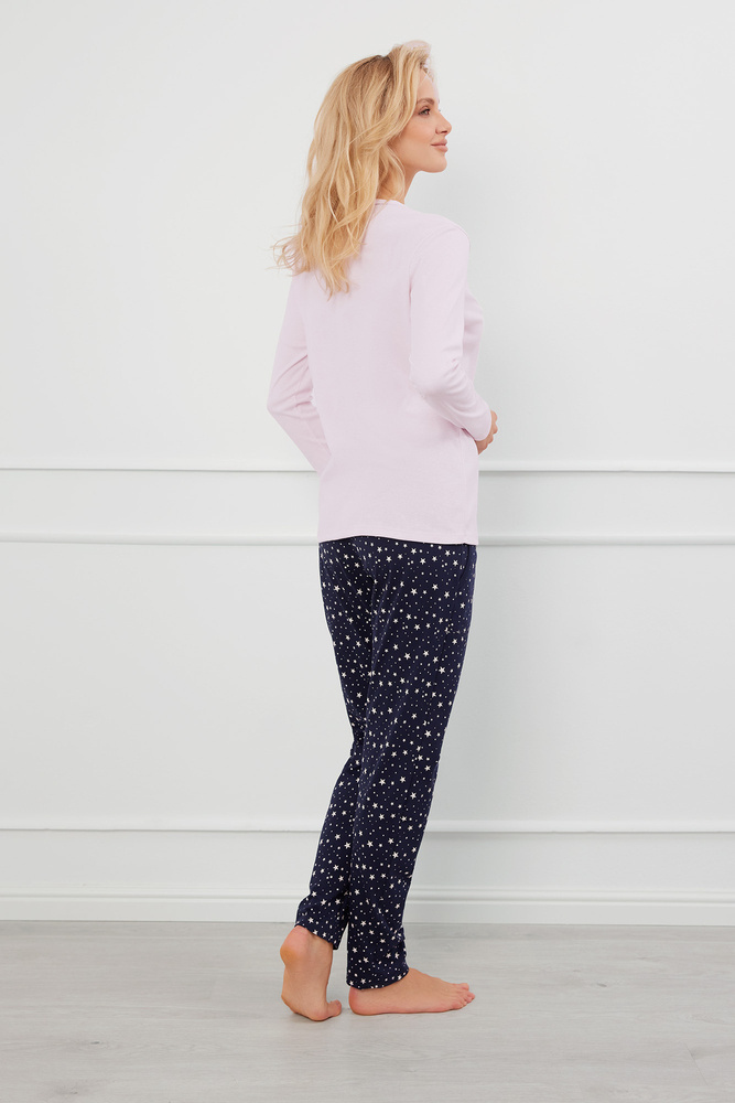 Разкопчана дамска пижама от памучно ребро, отличаваща се с неподвластен на времето дизайн. Тя е с класическа кройка с дълги ръкави и V-образно деколте, което е обточено с фин конец в контрастен цвят. Дълги панталони с модерен принт на звезди привличат погледите. Практични джобове отстрани. Добавете факта, че това е дамска пижама без копчета, а ясно обозначеният панел с копчета придава класа и изящество на цялата визия.