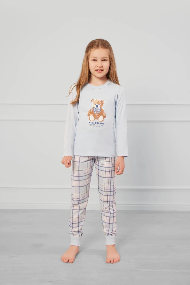 Тази очарователна пижама за момичета се отличава с меко прилепнала кройка за комфорт и свобода на движенията. Горнището на пижамата е с дълги ръкави и кръгло деколте и е украсено с щампа с очарователно мече и надпис "Sweet Dreams" Италианска мода от Guazzone. Панталонът е с класическа кройка и модерен кариран десен, а в долната част на крачолите има практични връзки, които предотвратяват изхлузването му по време на сън.