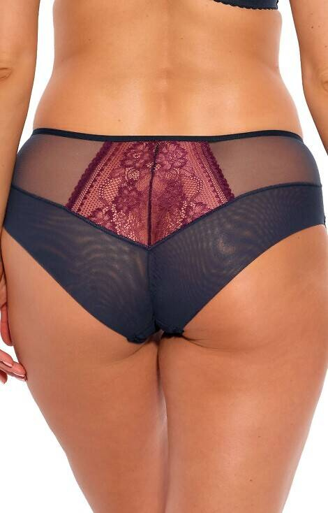 Дамски бикини с пълна, вградена кройка. Изработен от прозрачна мрежа и ажурна дантела. Плосък еластичен колан.