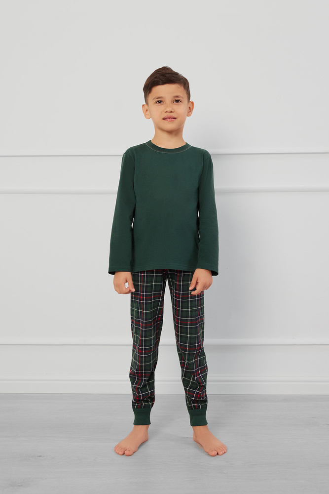 Тази детска пижама с права линия се състои от едноцветна блуза с кръгло деколте и кариран панталон с практичен колан с шнур. Класическата кройка не ограничава движенията, а висококачествената, мека материя е приятна за кожата и гарантира топлина и комфорт през цялата нощ.