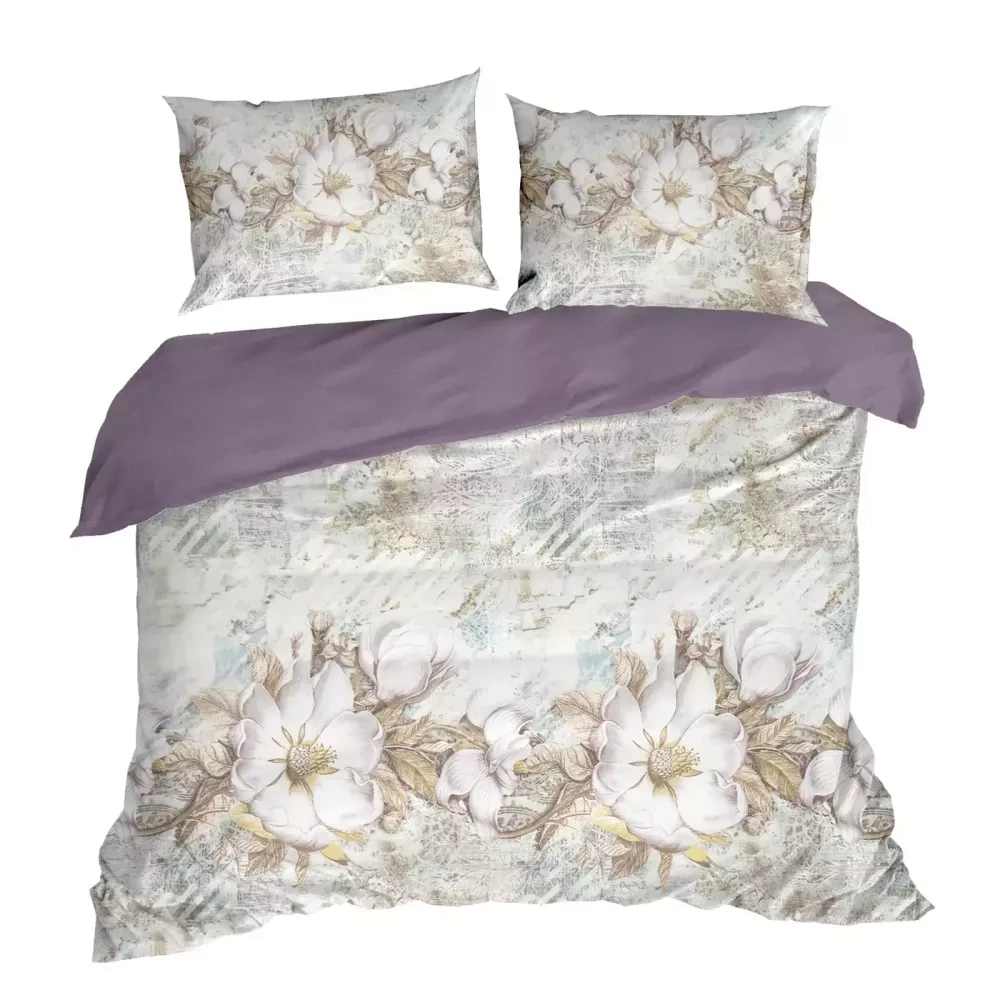 Пролет 26 Цветя спално бельо сатен евро пердета кремаво/лилаво