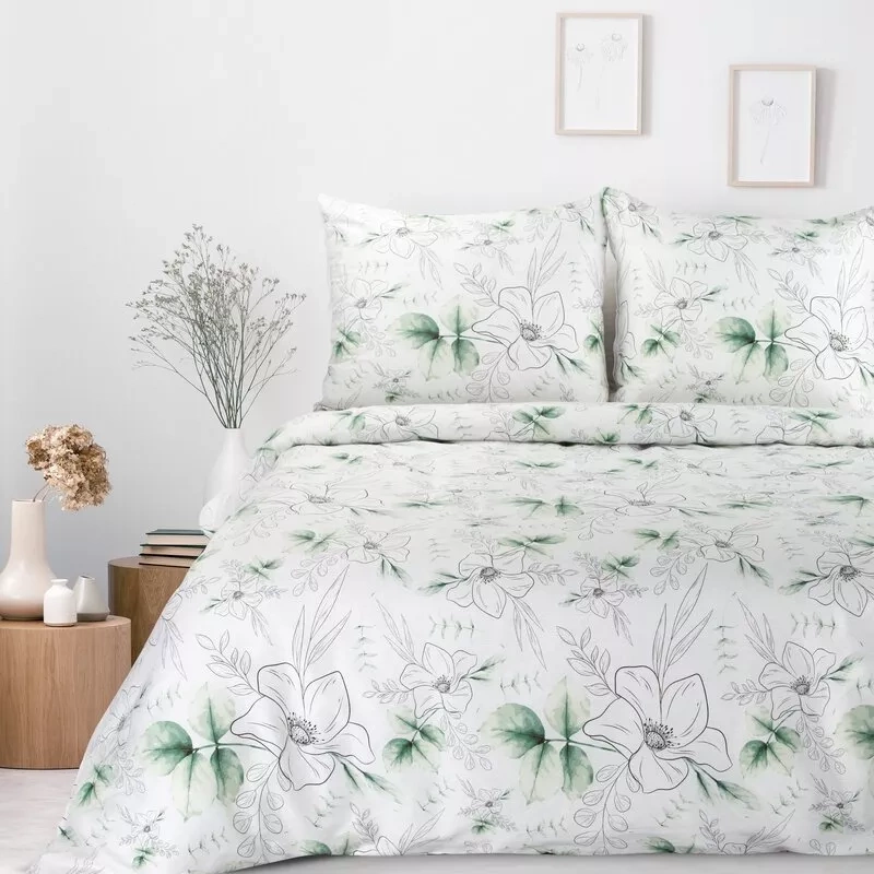 Пролет 28 Цветя спално бельо сатен евро пердета бяло/зелено