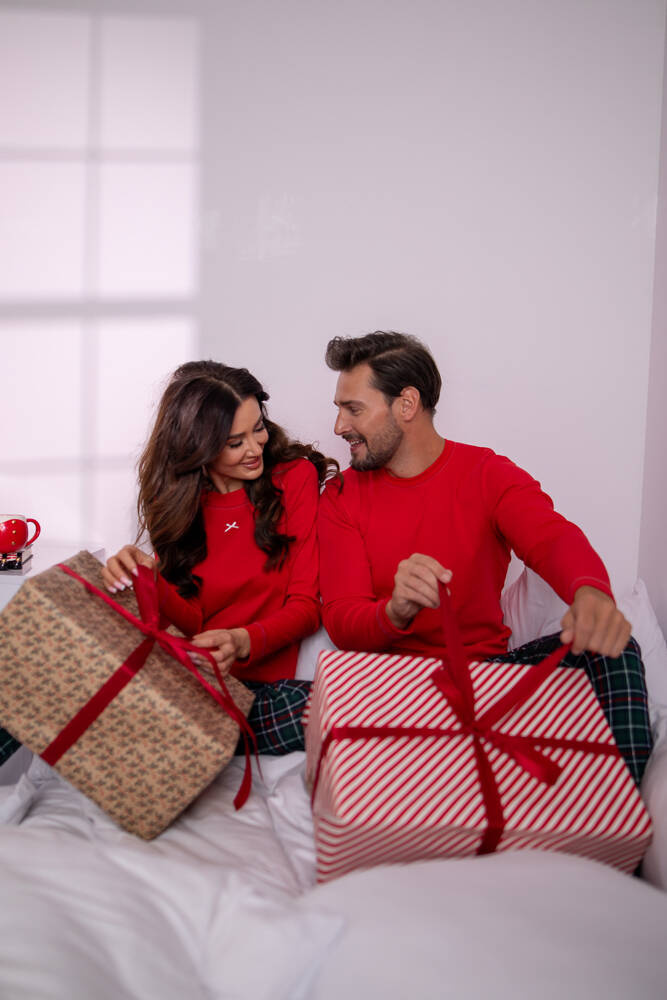 Дамските коледни пижами са решението за любителите на коледната тематика. Има семпла, удобна кройка за комфорт по време на сън. Горнището е плътна блуза с дълги ръкави, обточени с контрастен конец. Завършва с малко кръгло деколте с лайсна. Под него има декоративна панделка. Долната част на комплекта се състои от дълги панталони с вечен каре. Комплектът е изработен от мек и приятен на допир 100% памук.