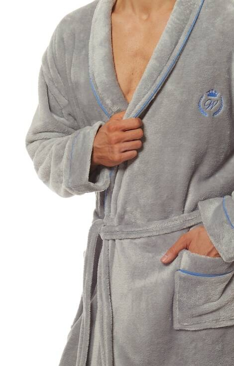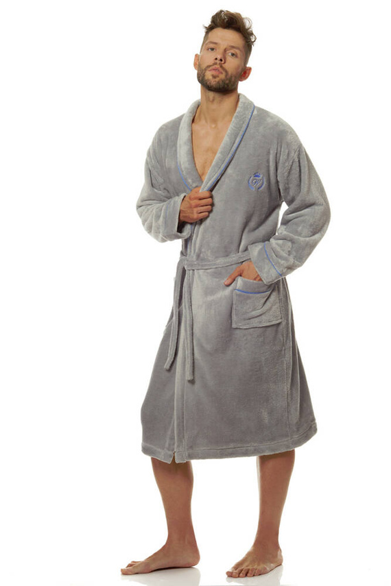 Класически мъжки халат, връзващ се на талията, изработен от мека материя. Външни джобове на ханша и пришита апликация на нивото на гърдите. Приятен и приятен на допир, гарантира комфорт при носене.