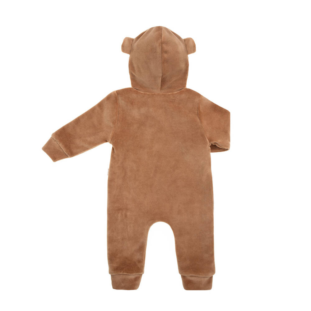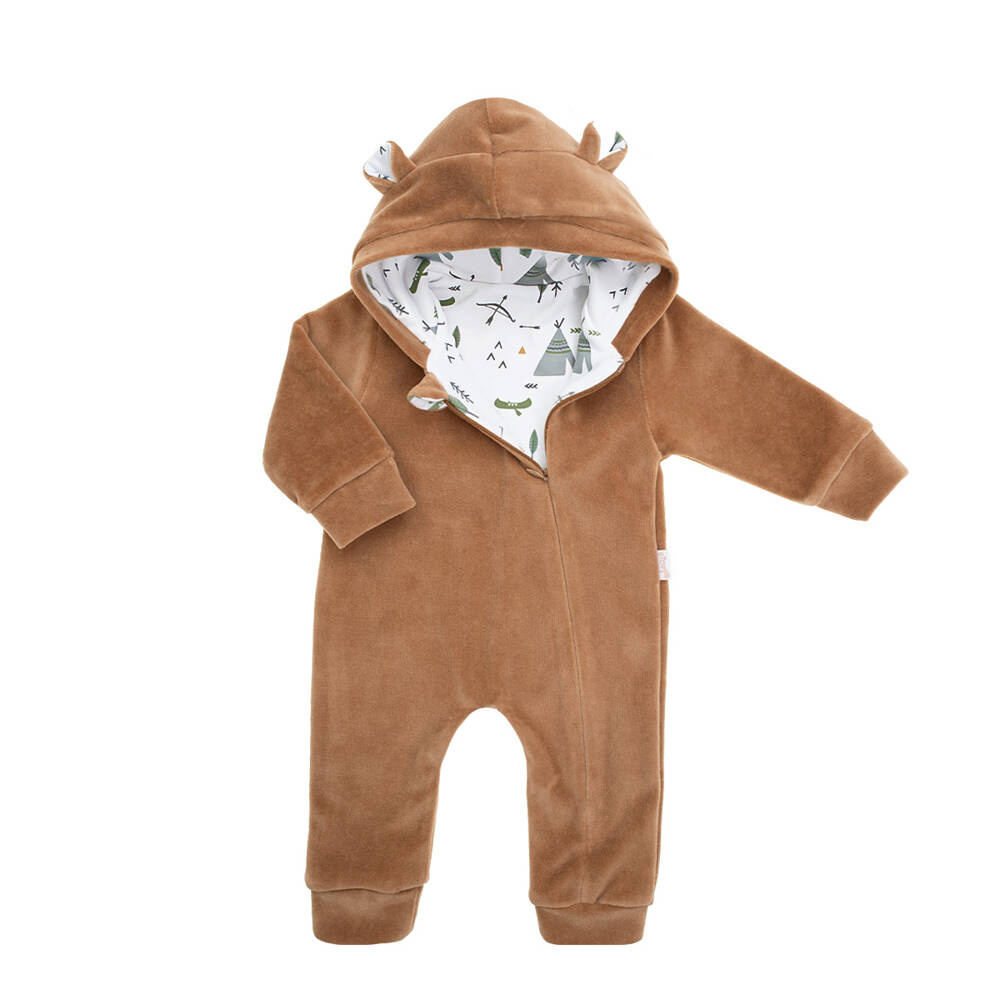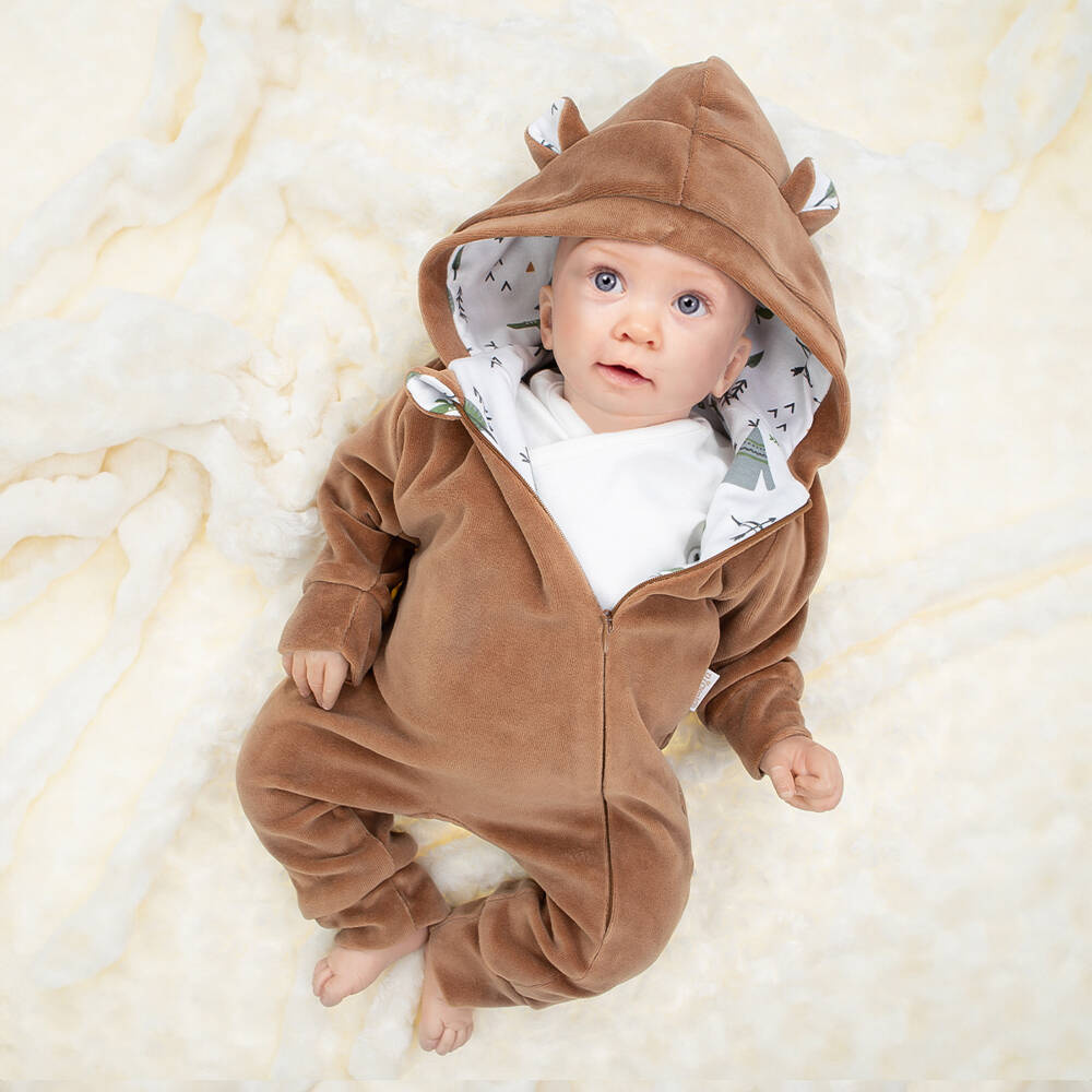 Кадифено клоунче в кафяви и бежови цветове. Подплата от 100% бял памук. Перфектен за по-студените дни. Има маншети на крачолите и ръкавите. Материалът е безопасен за деца.