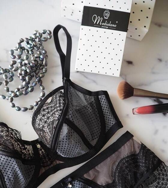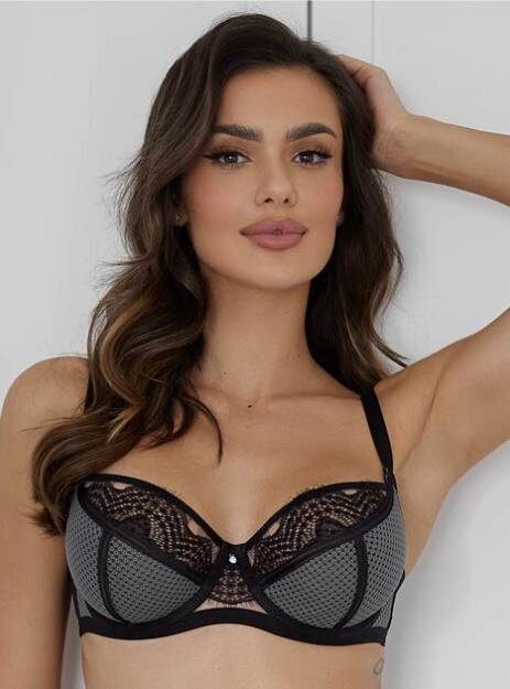 Сутиенът радва с изискана комбинация от материали и детайли. Чашките в долната част са изработени от нежен тюл, който е покрит с елегантна сива мрежа. Обиколката на сутиена, както и чашките, също е изработена от тюл, обшит с мрежа, което осигурява лекота и ефирност. Липсата на странични банели повишава комфорта при носене. Шевовете са дискретно покрити с черни ленти, които придават елегантен завършек на сутиена. Горната линия на чашките е декорирана с нежна черна дантела, която придава чувствен чар на цялото.