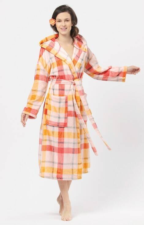 Дълъг дамски халат от меко трико, декориран с шарка на каре.