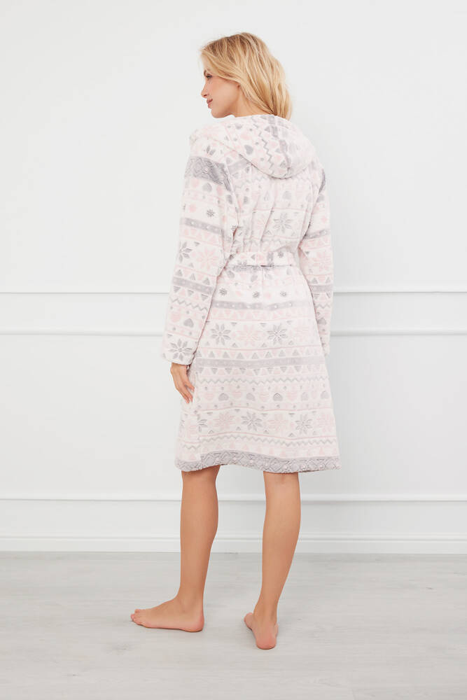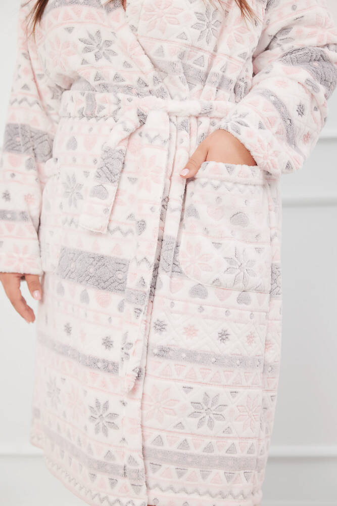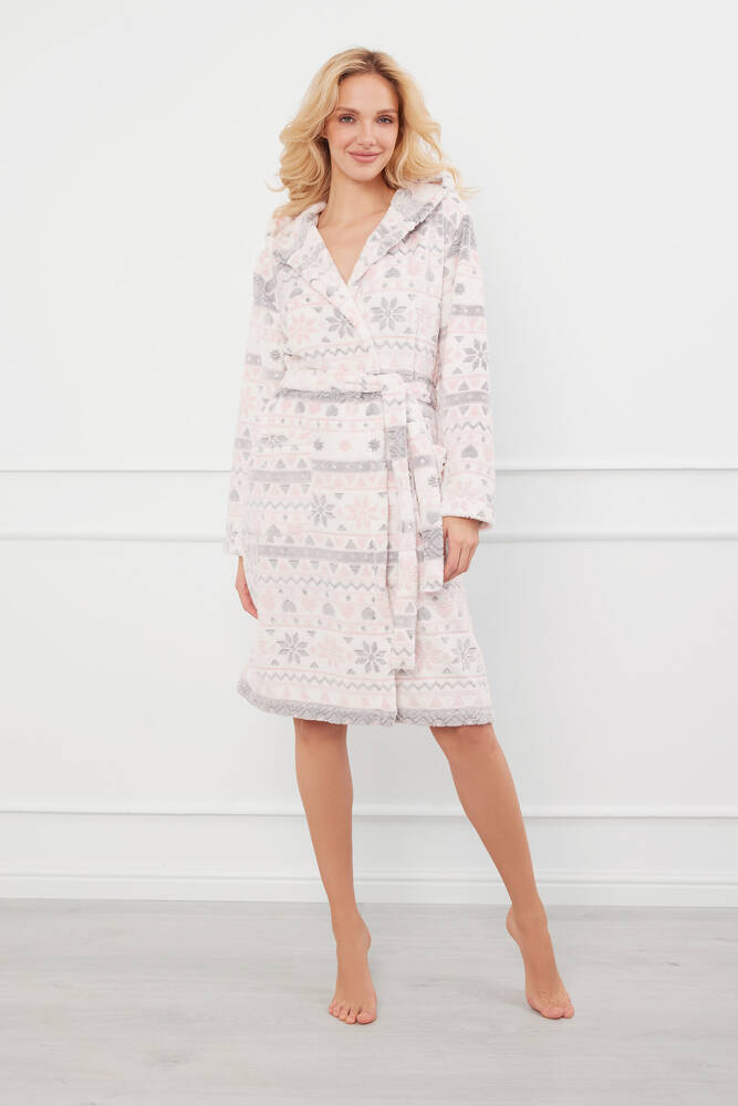 Топъл дамски халат, изработен от мек, пухкав бифлейс за изключителен комфорт и топлина. Класическата кройка е обогатена с практична качулка за допълнителна защита срещу студа. Халатът има и два практични джоба и колан за завързване на талията, за да пасне идеално. Меки пастелни цветове с фини скандинавски шарки придават очарователен и женствен характер.