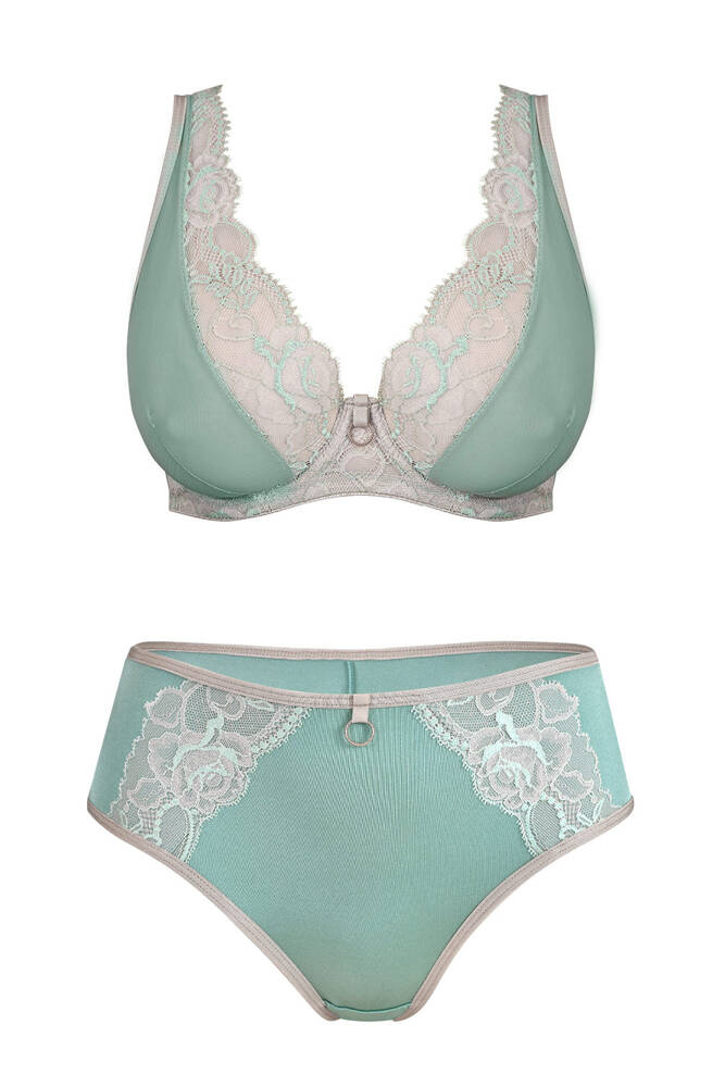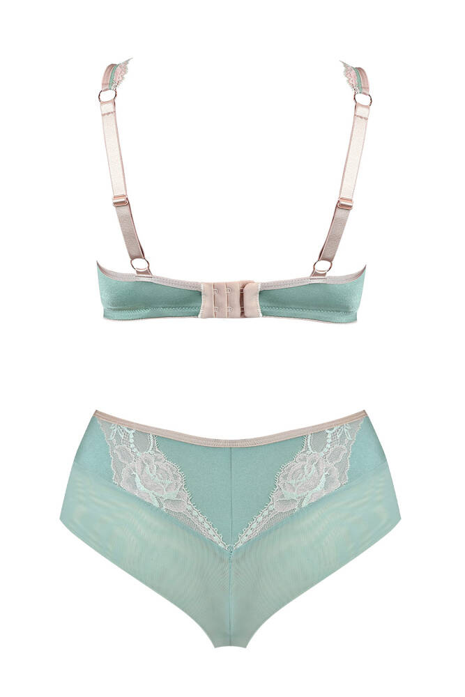 Бразилски слипове. Високо изрязан гръб от зелен микрофибър. Предница от бежова дантела с флорален мотив със зелен конец, страни от микрофибър. Има бежов кант на талията с бижутерска декорация във формата на кръг.