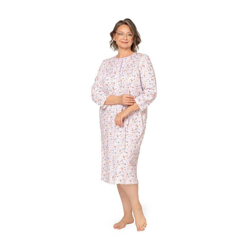 Дамска разкопчана нощница с 3/4 ръкав е перфектен вариант както за лятото, така и за по-хладните нощи. 100% памук, приятен за кожата, осигурява адекватен топлинен комфорт, а нежният флорален мотив ще се хареса на всяка жена. Дамската нощница е отворена на деколтето, което я прави идеална за кърмачки. Тази памучна дамска спална риза е гаранция за комфорт и свобода всяка вечер. Дамската нощница се предлага в размери от М до XXXL