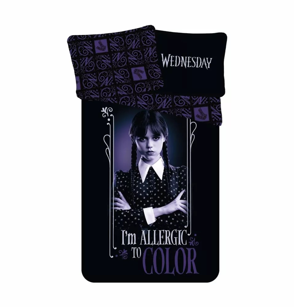 Памучно спално бельо 140х200,идеалният избор за феновете на емблематичния герой Уензди Адамс и семейство Адамс. Приятен на допир, не дразни кожата, създава приятно настроение преди сън и след събуждане. Двулицев плик за завивка допълнително ще разнообрази визията на спалнята на вашето дете. Другата страна на плика е в цветовете на снимката. Идеална идея за подарък.