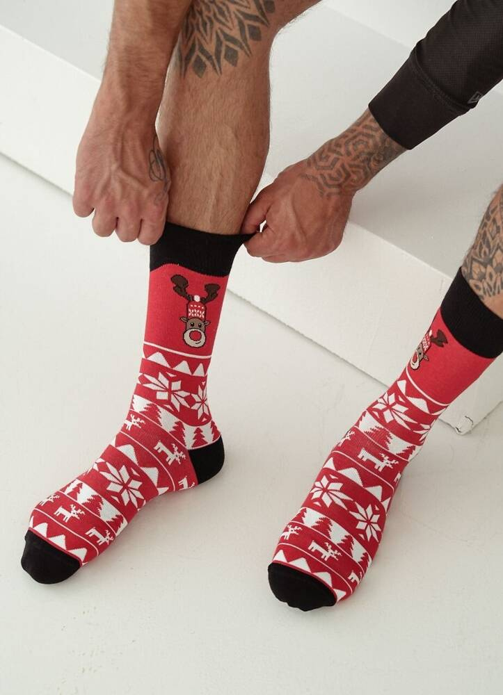 1290-022 Коледни мъжки чорапи с норвежки елени Милена - червени
