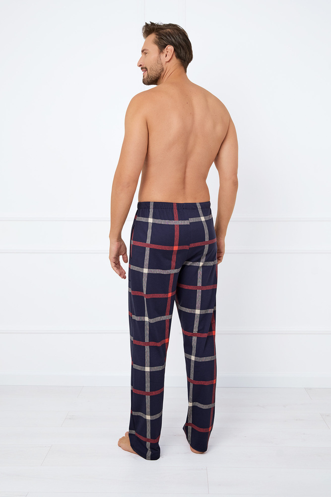 Изработени от мек 100% памук, мъжките панталони за пижама са с права кройка и са украсени с широка карирана шарка в нюанси на тъмносиньо, бяло и червено, което им придава елегантно, но вечно усещане. Снабдени с практични джобове отстрани, те предлагат допълнителна функционалност. Талията на панталона е обогатена с декоративен шнур, който подчертава стилния външен вид.