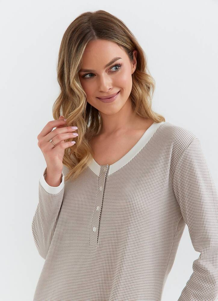 Дамска риза с дълъг ръкав от висококачествен интерлок памук. Деколтето и маншетите са декорирани с еднакви кантове. Дължина до коляното.