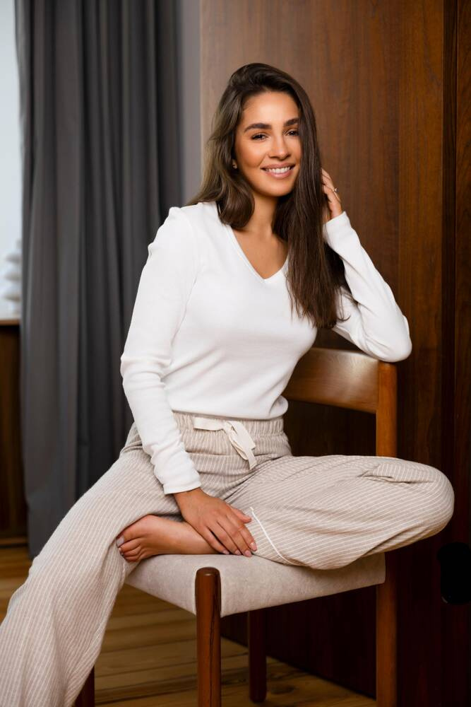 Дамска пижама, изработена от висококачествен памук. Тениска с дълъг ръкав, v-образно деколте.