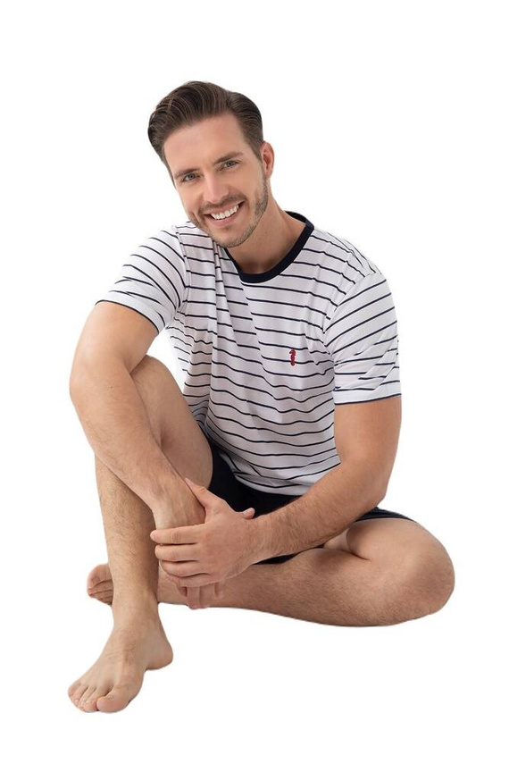 Мъжка пижама от висококачествен памук. Тениска с къси ръкави, обла яка. Комплектът включва къси шорти с удобни джобове