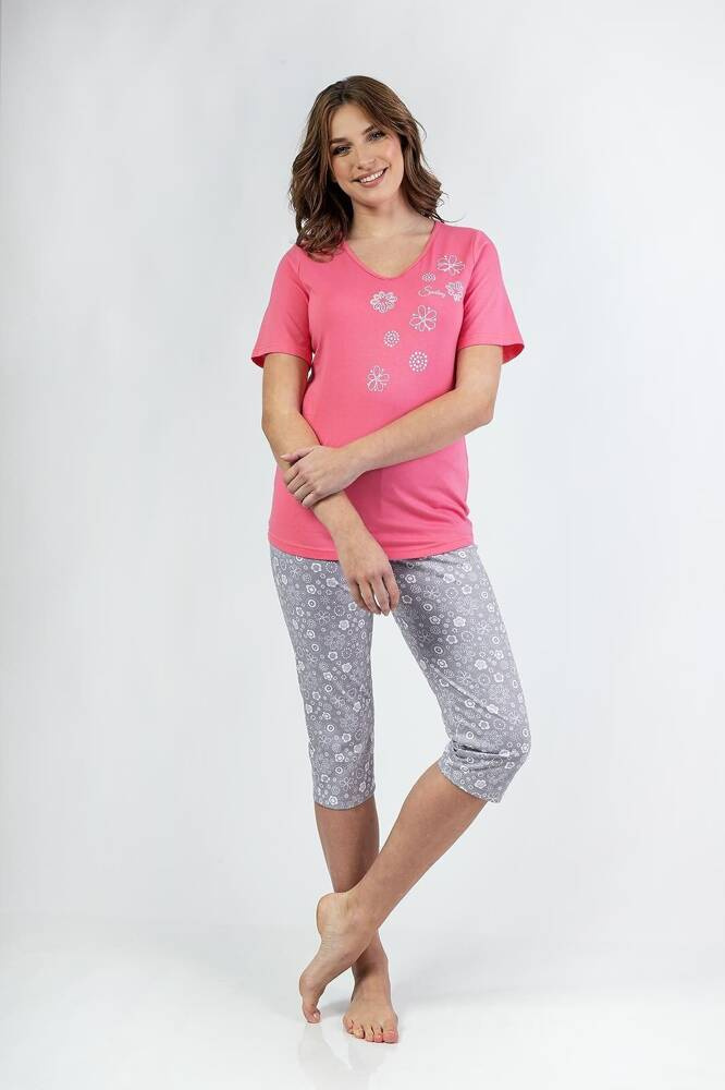 Дамска пижама от висококачествен памук. Тениска с къс ръкав, V-образно деколте