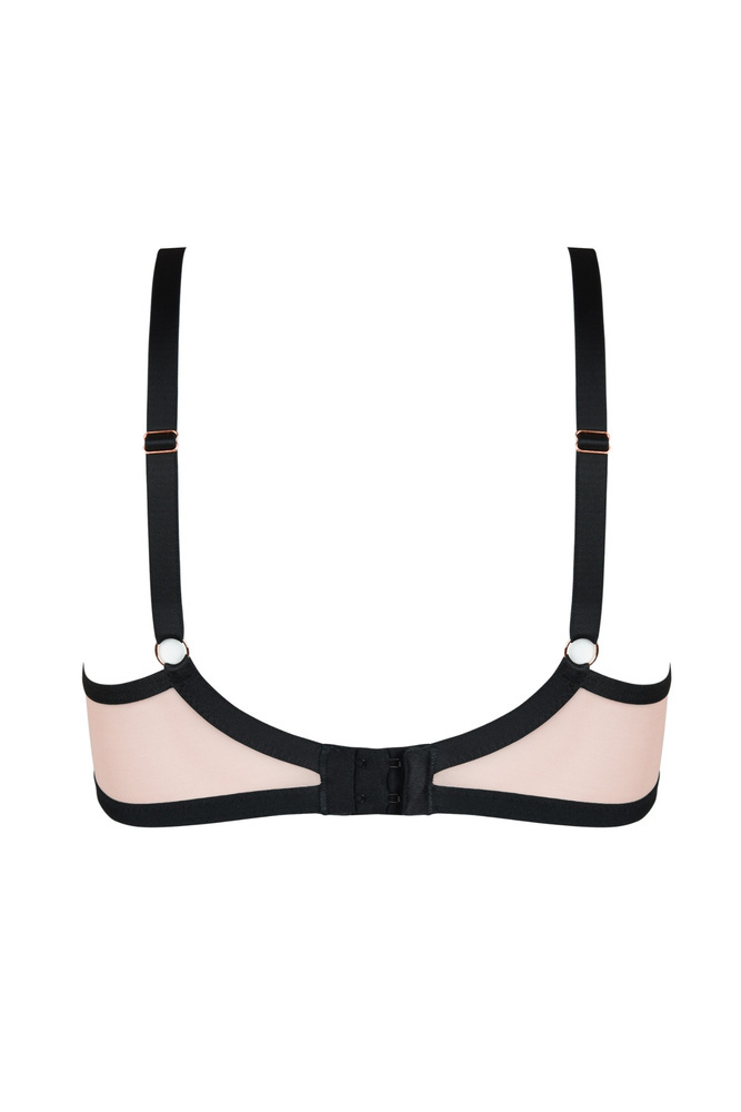 Сутиенът Cabarette е същността на лукса и изтънчеността. Предназначен за средни и големи гърди. Бежови мрежести чаши, декорирани с богата дантела със златни нишки, привличат вниманието с елегантния си дизайн. Черните панделки придават характерен характер на модела, като перфектно подчертават женствените форми. Обиколката от бежова мрежа осигурява комфорт, а липсата на странични банели повишава удобството при носене. Отличен избор за жени, които ценят комбинацията от функционалност и чувствено излъчване.