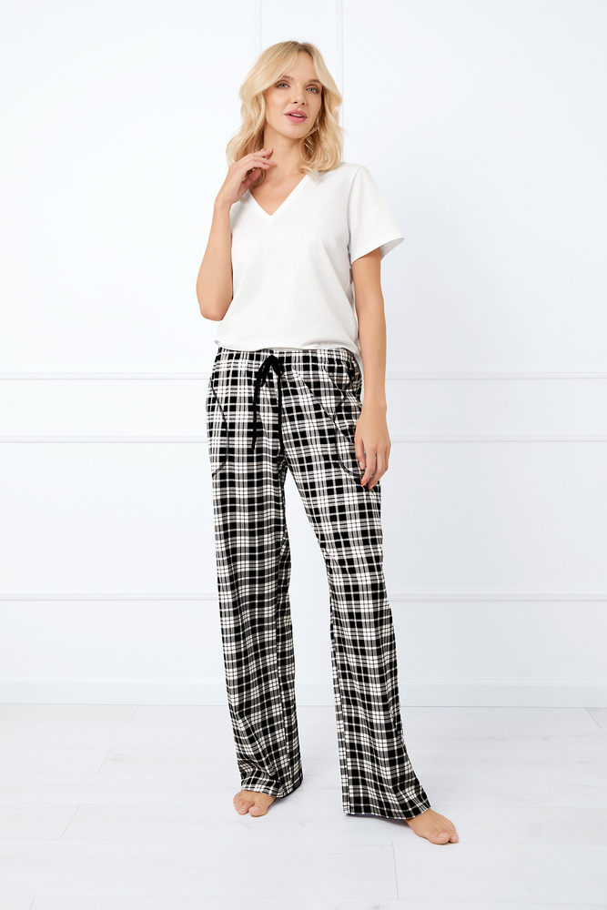 Дълги дамски панталони за пижама, предназначени за комфорт по време на сън и почивка. Класическа, свободна кройка. Еластичен колан без натиск с декоративен шнур. Цялата дреха е украсена с каре и е изработена от мек и дишащ памук, който е подходящ за всички сезони.