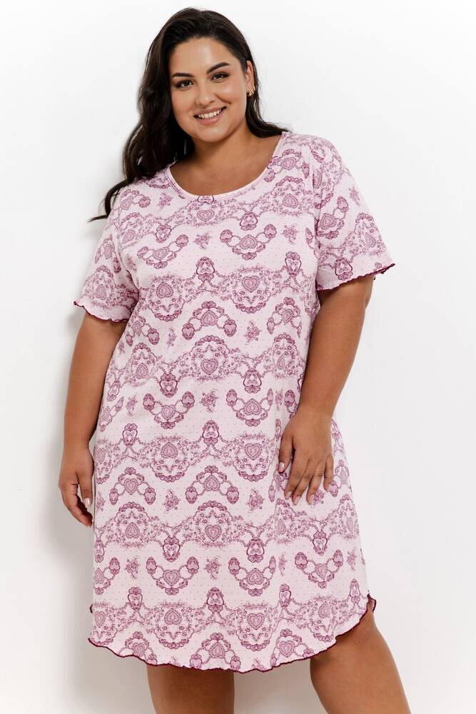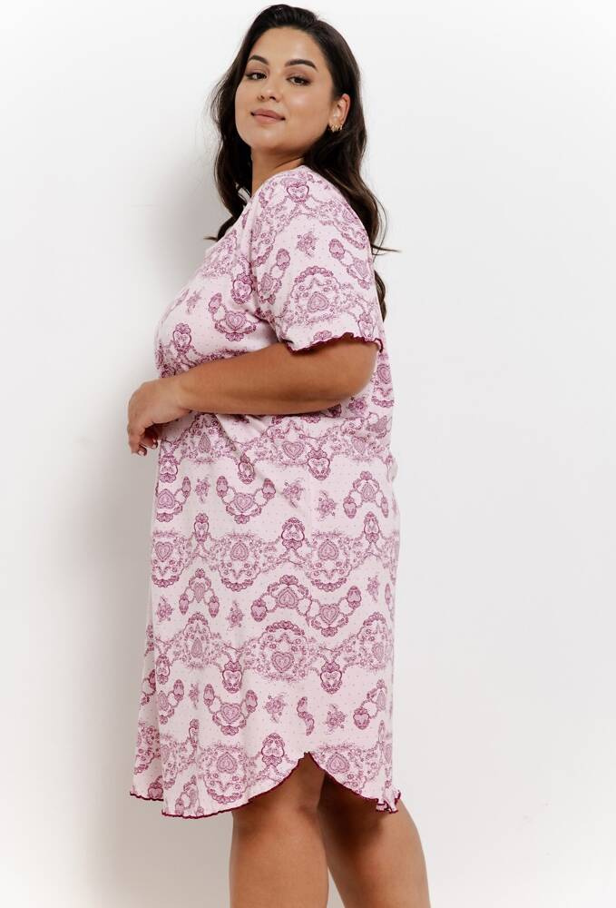 Дамска риза с къс ръкав. Цялата е изработена от висококачествен памук, декориран с дантела. Обло деколте. Дължина над коляното